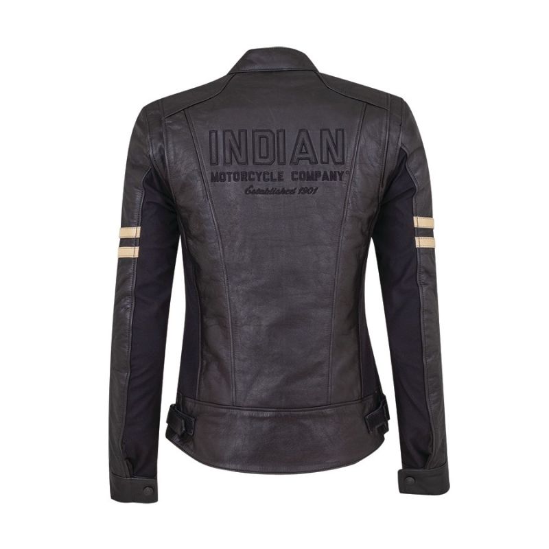 A soft black leather jacket with stretch side panels and contrast color twin racing stripes across the sleeves. Jacket has modern Indian Motorcycle® branding on the back panel and also features a removable quilted liner for cooler days. This jacket has protectors that are lightweight, slim, very flexible and highly protective, making them feel almost invisible when worn. It makes the jacket very comfortable, with a slimmer profile shoulder and elbow, but still provides the level of protection as other CE certified protectors.