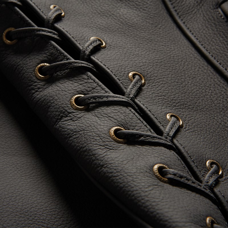 Black leather side seam lacing revs up the powerful style of this Ladies Indian Vest. This leather vest features a flattering cut, snap front, convenient pockets, and powerful Indian Motorcycle® branding on the front and back.