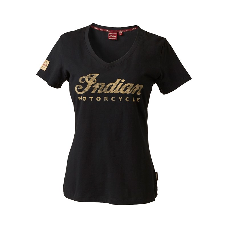 A vintage look with a modern fit. This ladies’ cut V-neck T-shirt features a sand-colored distressed Indian logo across the front