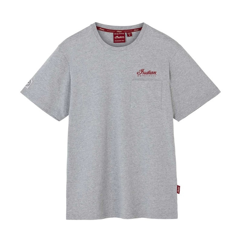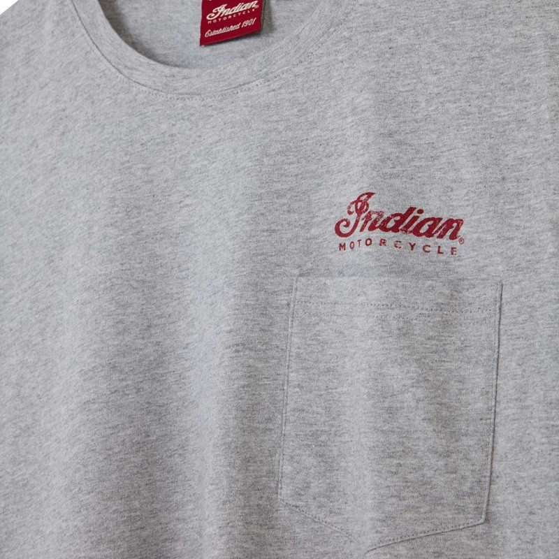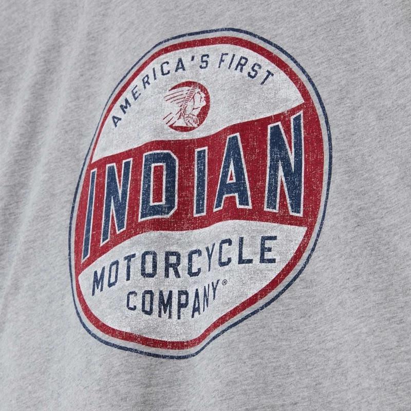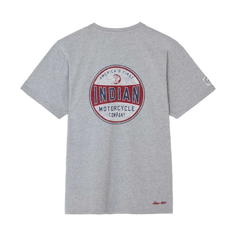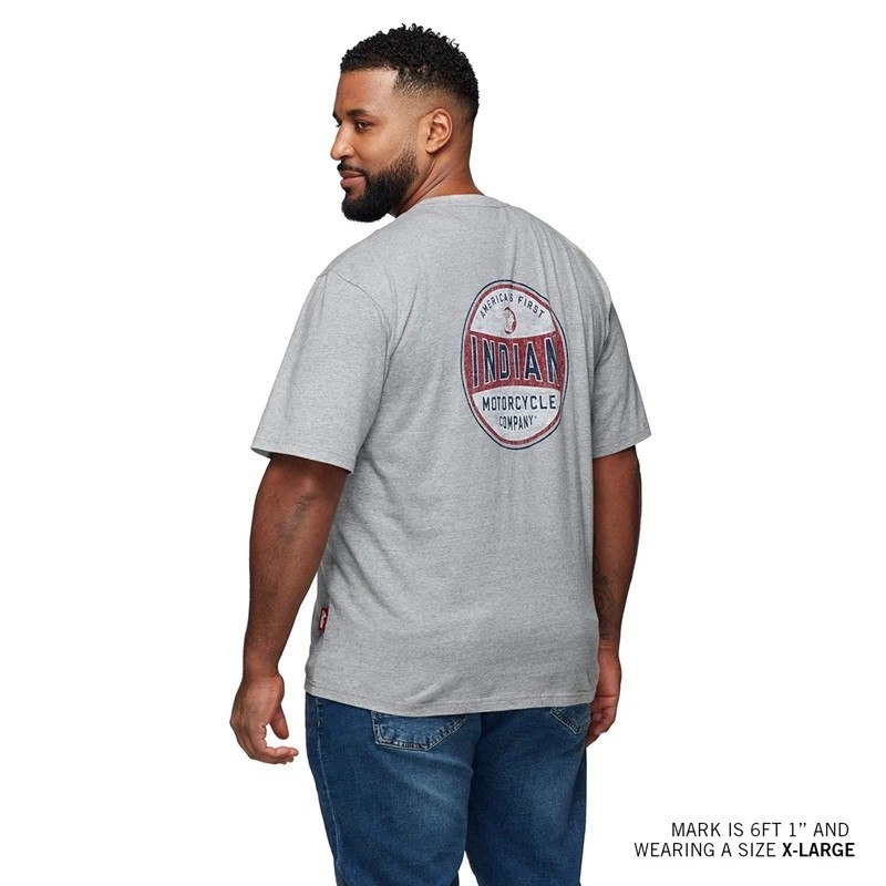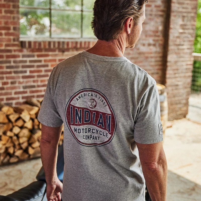- Large printed script Indian Motorcycle graphic on the back and small printed script logo on the front