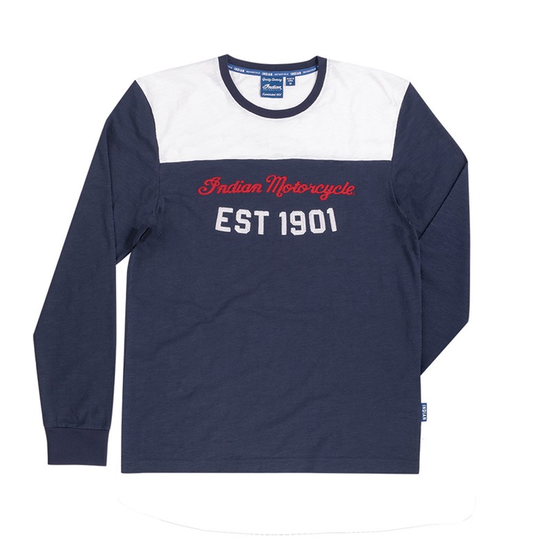 Dark navy and white slub jersey, this retro styled T-shirt is crafted with flat stitch embroidery and chainstitching.