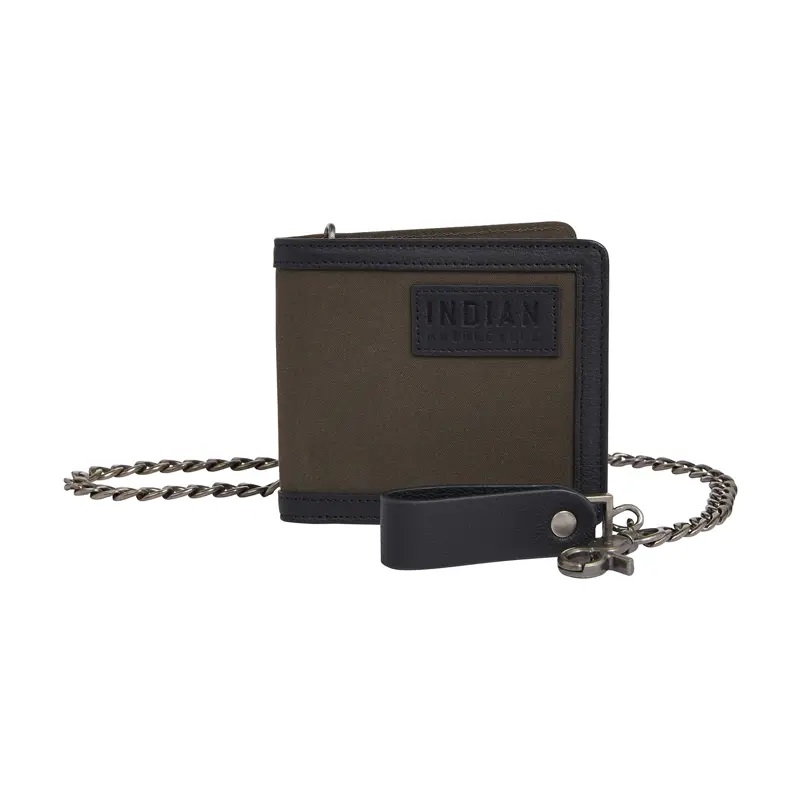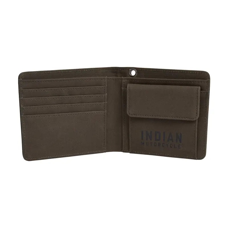 The bi-fold wallet features premium dry wax cotton canvas & high quality leather trim, with an external embossed brand logo leather patch.
