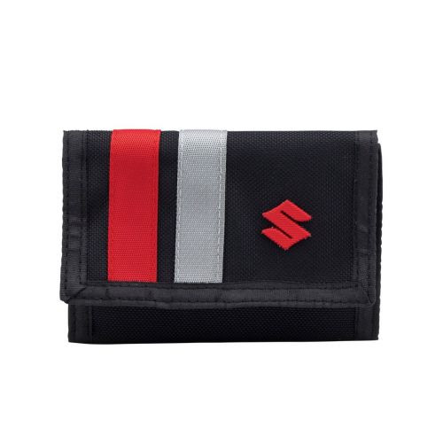 Black wallet with red Suzuki logo, printed stripes, with multiple compartments for money and credit cards.