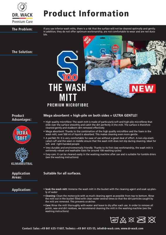 • Care: Rinse the mitt thoroughly with water and leave to dry after each use. In order to remove all polish, wax and dirt residues, we recommend cleaning the mitt in the washing machine (see the washing instructions)