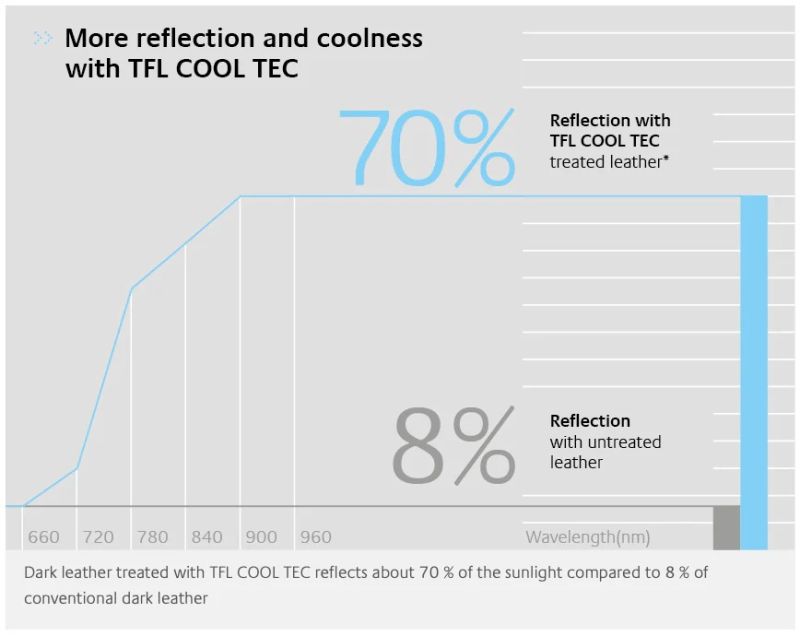 - TFL® UV Reflective Treatment = 70% UV Bounce Back, 25c Temperature Reduction