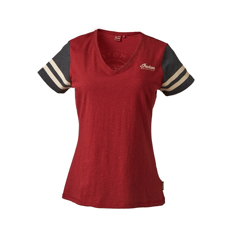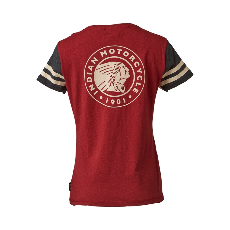 A lightweight red marl T-shirt with contrast gray marl sleeves and applied arm stripes in antique white. The Indian Motorcycle® icon is printed on the back in a white water-based print.