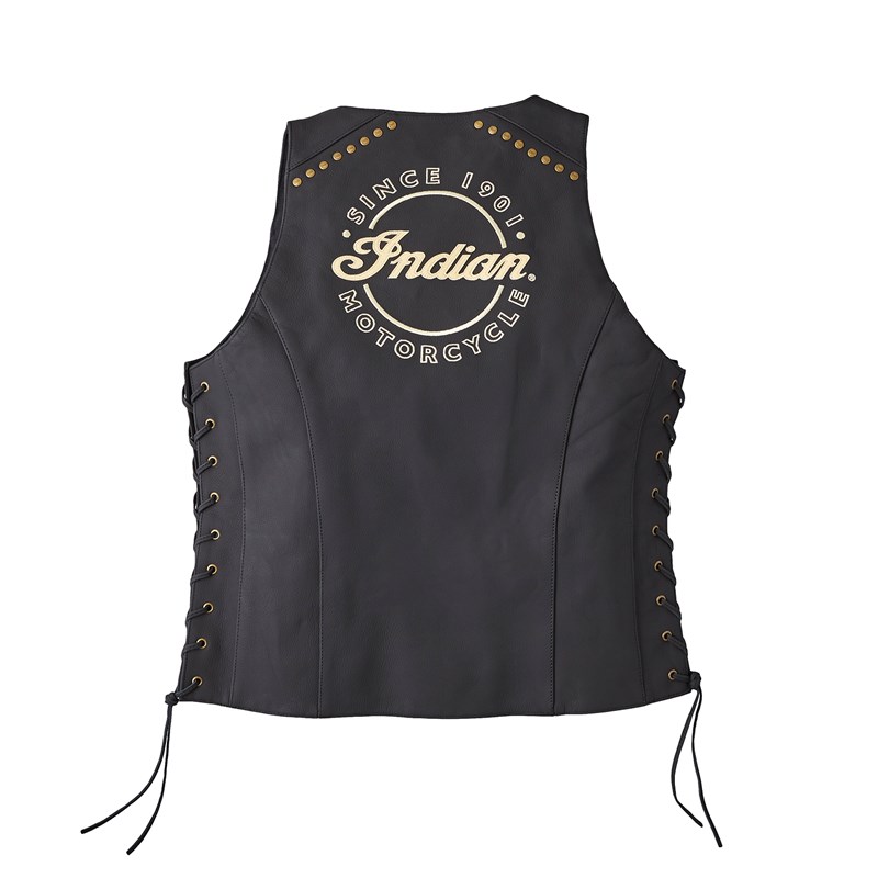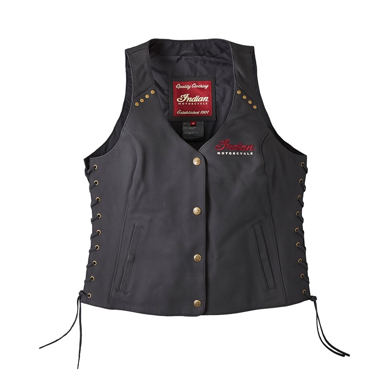 Black leather side seam lacing revs up the powerful style of this Ladies Indian Vest. This leather vest features a flattering cut, snap front, convenient pockets, and powerful Indian Motorcycle® branding on the front and back.